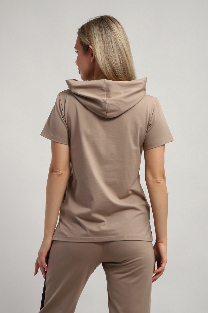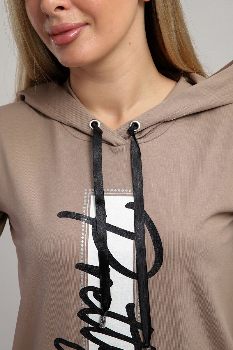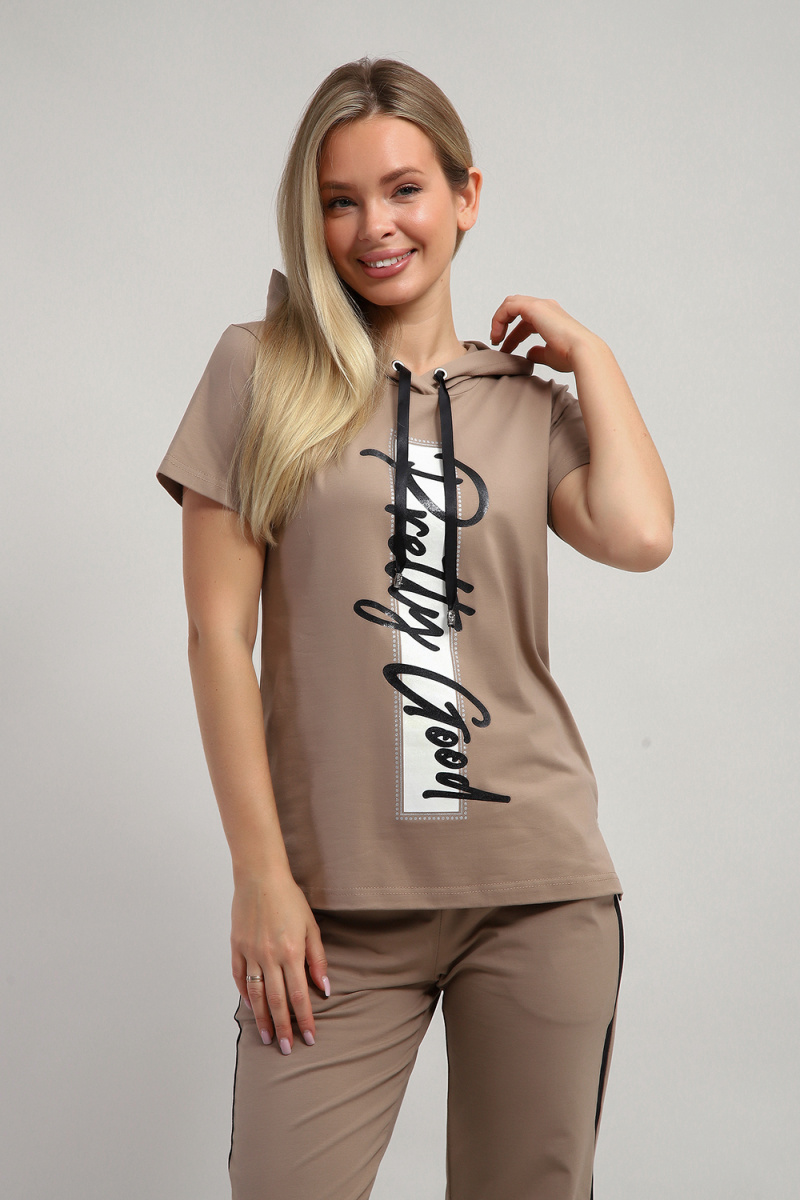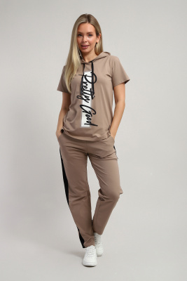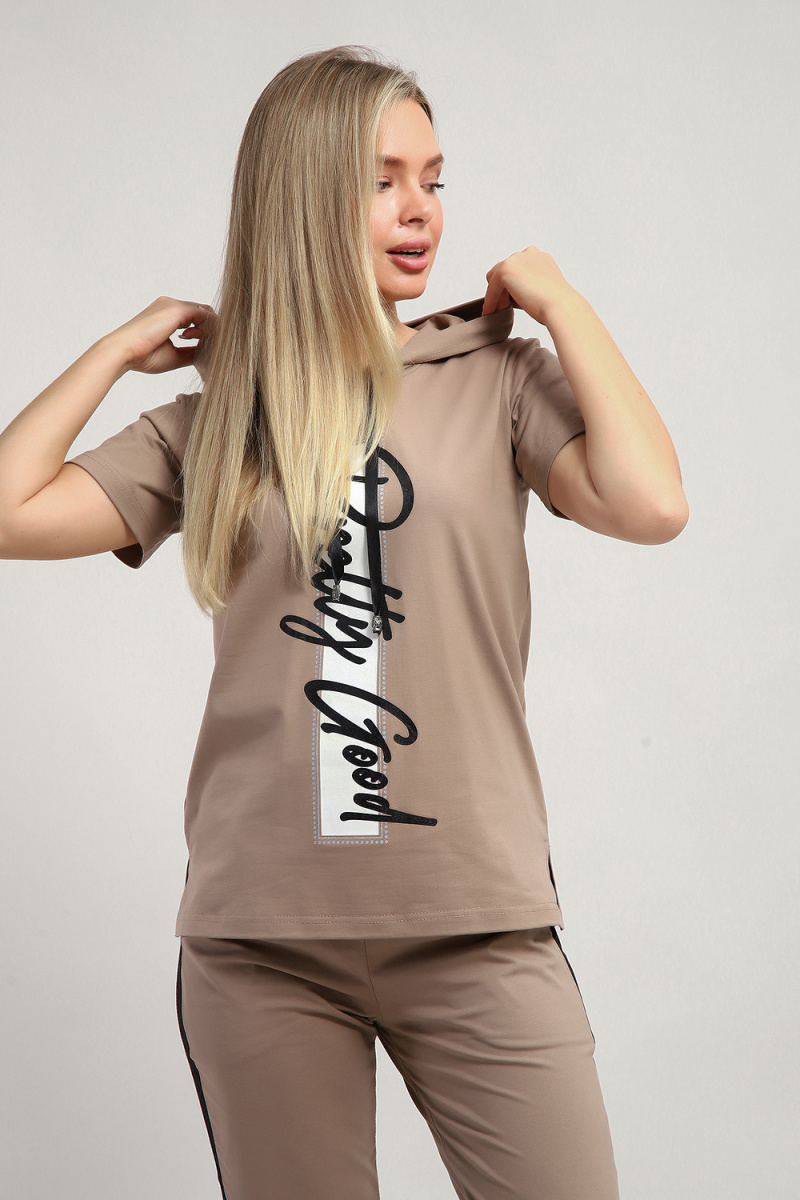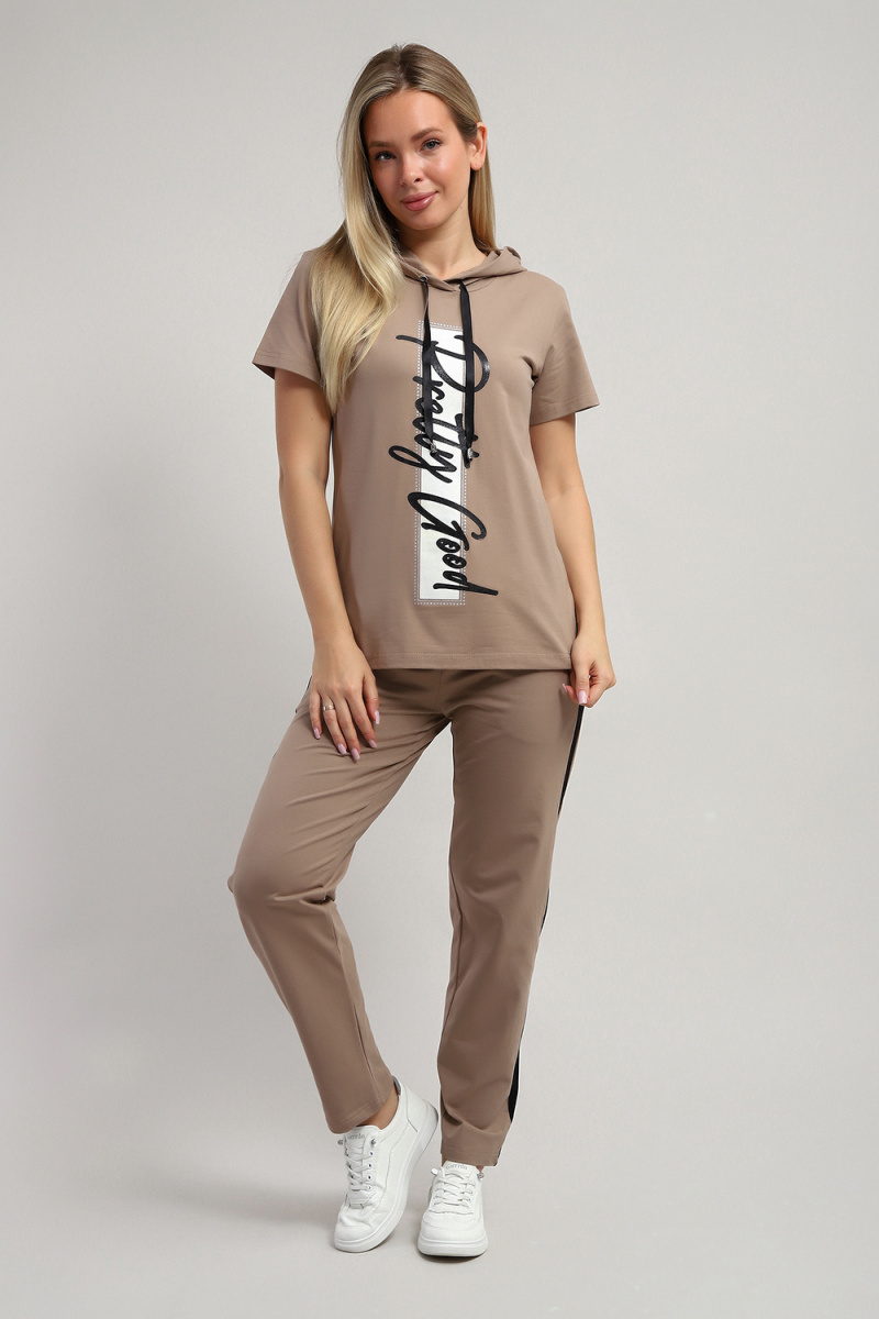 Стильный женский костюм из легкой дышащей ткани. Сшит из мягкого трикотажного полотна высокого качества. Основной изюминкой костюма является яркий принт на полочке кофты, расположенный вертикально и контрастирующий с общим фоном. Кроме того, на кофте имеется капюшон, объем которого регулируется тонкой лентой. Этот универсальный и практичный повседневный костюм в спортивном стиле будет удобным и комфортным во многих ситуациях. Комплект отлично подойдет для спорта, бега или танцев. Брюки свободные с яркими лампасами, двумя боковыми карманами, на широком поясе с резинкой. Каждую вещь вполне можно использовать по отдельности. Комплект отлично подойдет для женщин любого возраста и поможет хозяйке выглядеть стильно, при этом даря чувство комфорта!